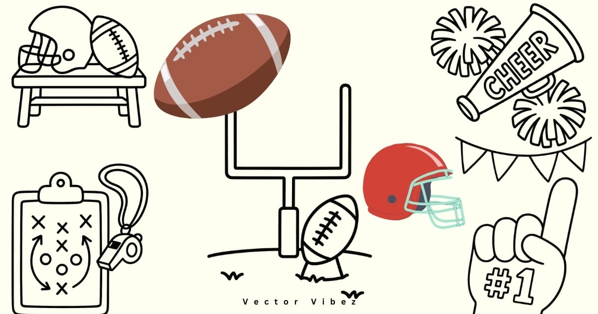 Bleachers, jerseys, marching band drums, cheer megaphones, scoreboards, and classic pigskin plays—all in simple, satisfying outlines.