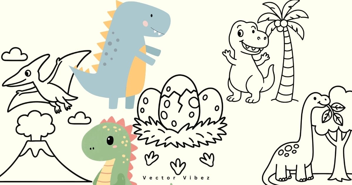 Friendly T-rex grins, triceratops trots, brontosaurus munches—plus footprints, ferns, and volcano silhouettes for extra flair.